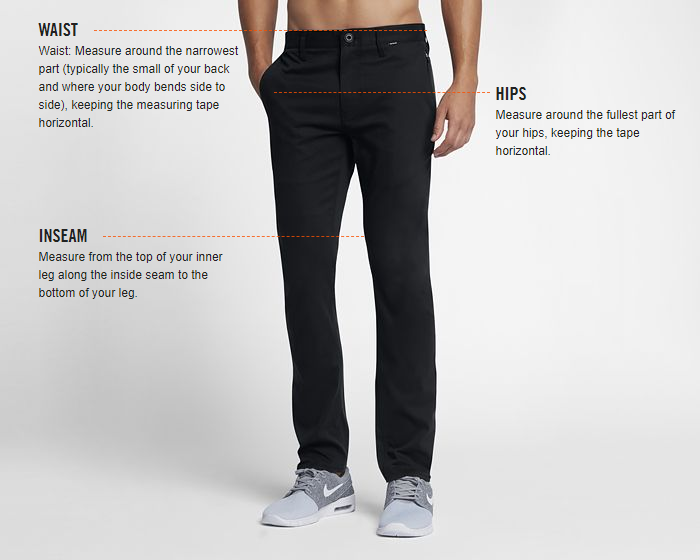 Use the chart below to determine your size. If one of your measurements is on the borderline between two sizes, order the smaller size for a tighter fit or the larger size for a looser fit. If your measurements for hips and waist correspond to two different suggested sizes, order the one indicated by your hip measurement.